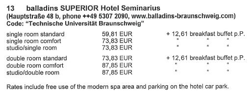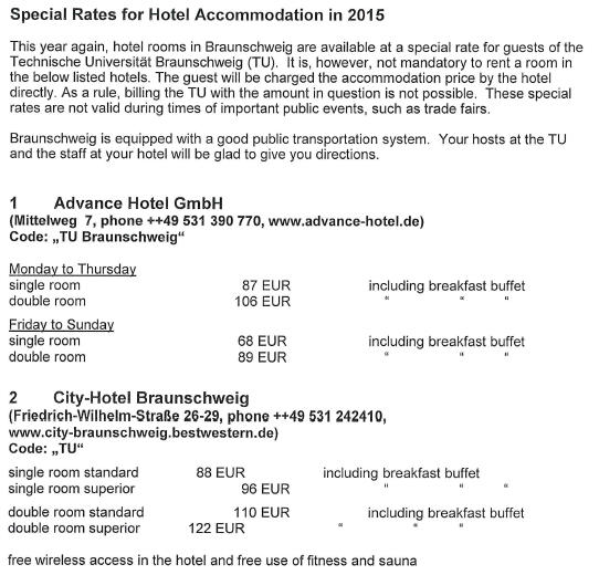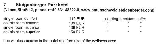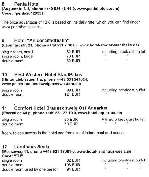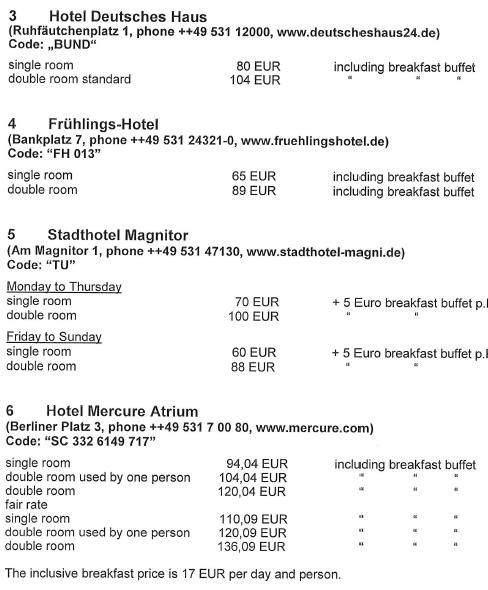 Note for low cost accomodation New youth accomodation venue (3 min walk) Youth Hostelhttp://www.jugendherberge.de/en/youth-hostels/braunschweig727/shortportraetModest quality yet affordable (7 min walk) Braunschweig Hotel http://www.bs-hotel.de/